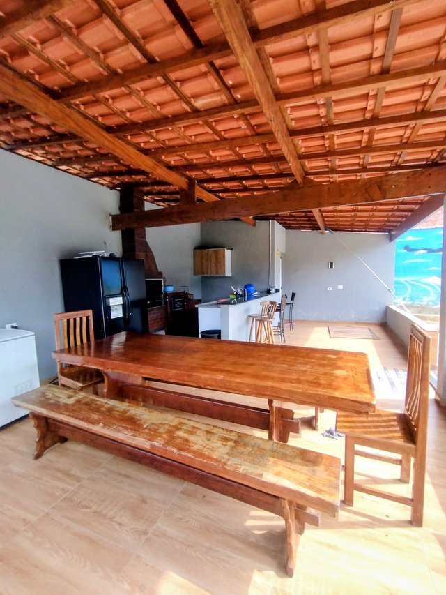 Área gourmet, com churrasqueira, forno e fogão à lenha.